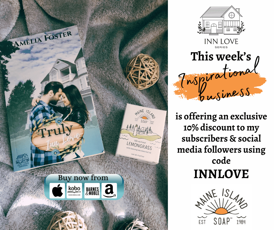 In book three, Secretly Inn Love, Ryann’s love interest is a guest at their hotel so I definitely needed him to be just as intrigued by the inn as he is by the adorable youngest Alden sister. Part of that draw was the lemongrass soap provided by the inn for their guests. It was 100% inspired by the lemongrass scent that Maine Island Soap created and, because I am dedicated to providing the most authentic story as possible, I knew I had to do some hands on research. Which clearly meant I needed to snag my own bar.